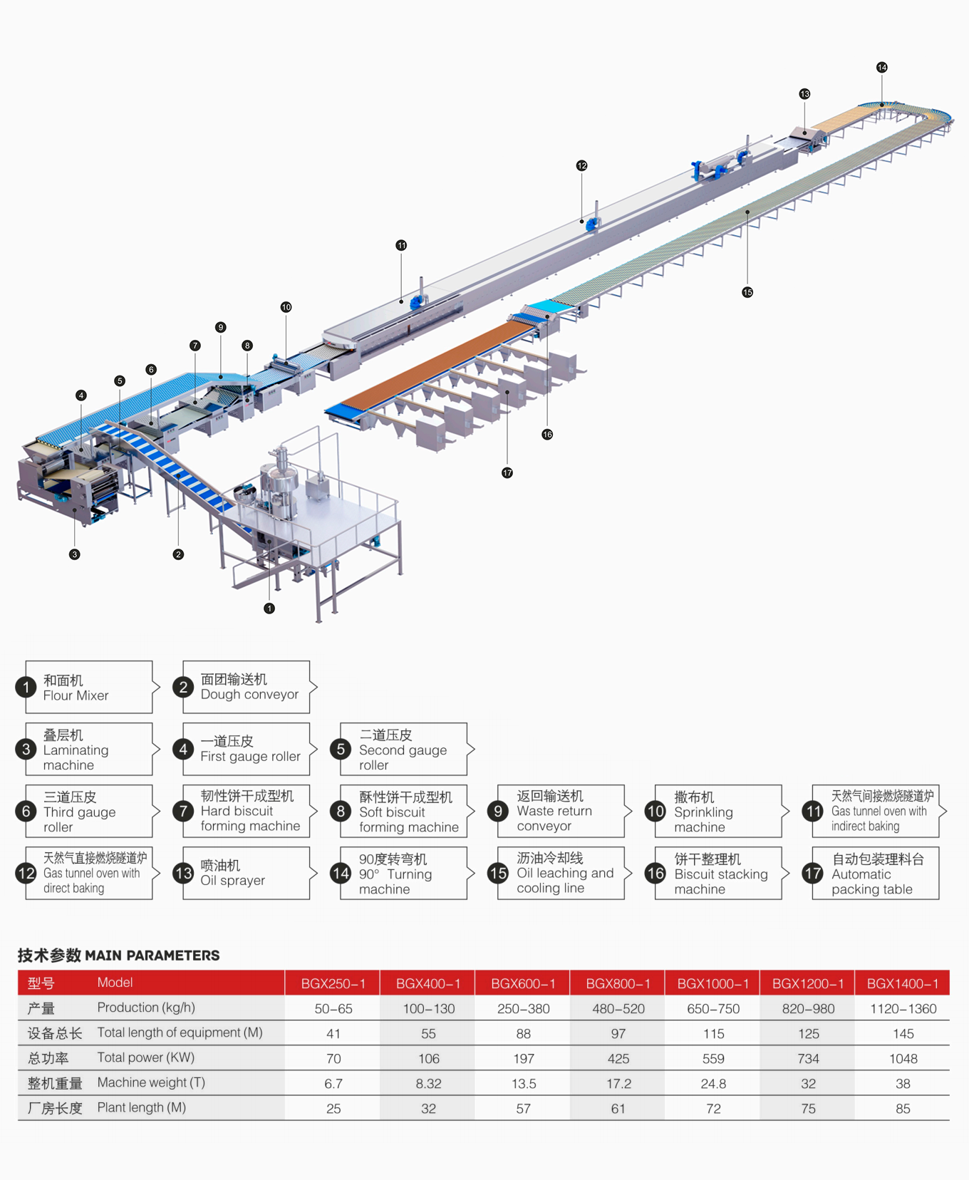 Different types of ovens can be selected depending on customer conditions: Electric heating, natural gas, liquefied gas and diesel burning furnace are divided into crispy, tough, soda, bear biscuits,cookies and other varieties according to the formula of biscuits. This equipment is a crisp, tough biscuit production line. The main process is: according to the formula flour The dough mixer is added to the laminating machine and then enters the laminating machine. The laminating machine enters the first two rolls, the second to the third two rolls are formed by the roll cutting printing, and then enter the oven baking,and the baking temperature Control is a very critical process, which is mainly divided into three processes: shaping,baking and coloring. Then enter the surface of the injector to spray oil.It is cooled by a cooling line and finally packaged by a packaging machine.